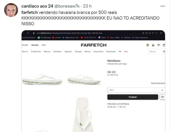 “Farfetch vendendo havaiana branca por 500 reais. Eu não estou acreditando nisso”, diz mensagem em post.
