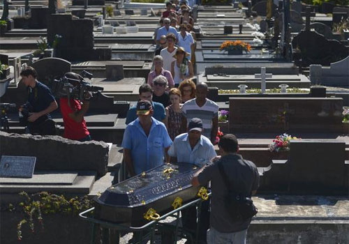 O corpo do cineasta Eduardo Coutinho, morto a facadas em seu apartamento no domingo, foi enterrado na tarde desta segunda-feira no cemitério São João Batista, em Botafogo, no Rio de Janeiro. O cortejo final foi acompanhado por cerca de 150 pessoas, entre elas vários artistas que trabalharam ou admiravam a obra do documentarista. Na hora do enterro, os aplausos duraram cerca de cinco minutos.