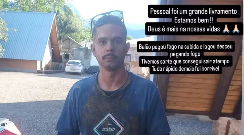 Na imagem publicada pouco depois da tragédia, ele aparece sujo da queda, descalço e relata estar sem o celular, que se quebrou durante o salto do balão. "Tivemos sorte que consegui sair a tempo. Tudo rápido demais, foi horrível", afirmou.