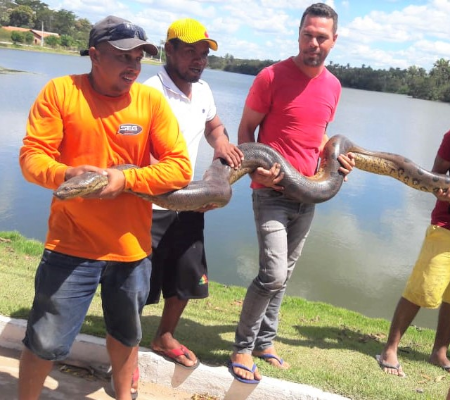 Uma cobra da espécie Eunectes Murinus, ou Sucuri-Verde como é conhecida, medindo quase quatro metros de comprimento, foi capturada por populares nas proximidades do açude de Água Branca, na manhã desta quarta-feira (24). No momento da captura, a serpente estava tentando atravessar a parede contenção da água no sentido açude.