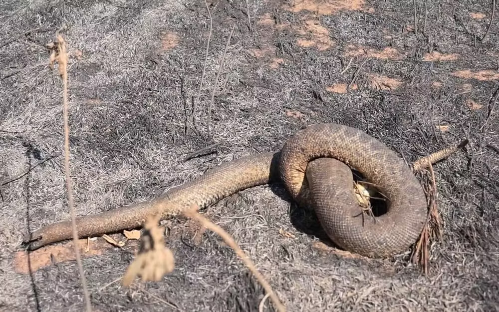 Uma sucuri, símbolo do Pantanal, foi encontrada carbonizada após tentar escapar dos incêndios que assolam o bioma. O trágico registro foi feito pela equipe de jornalismo da TV Morena na região da Estrada Parque, próxima a Miranda (MS), na quarta-feira (19). Além da sucuri, outras cobras menores foram vistas esturricadas ao longo do caminho, vítimas das chamas que já consumiram mais de 500 mil hectares.