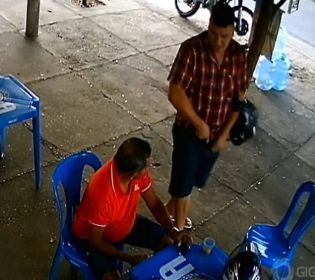 O suspeito sai do interior do bar e vai até o encontro da vítima. Ele saca uma arma de fogo e aponta para a vítima, que reage e começa a travar uma luta corporal com o criminoso, mas acaba caindo no chão e o bandido consegue roubar sua arma.