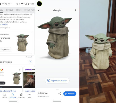 Pesquisar por “Baby Yoda”, “Bebê Yoda”, “The Child” ou “Grogu” no Google em um smartphone Android faz com que um card com a mensagem “Veja a criança em 3D” apareça entre os primeiros resultados. Clique no botão “Veja em 3D” para abrir um modelo tridimensional da personagem, que pode ser observado de vários ângulos.