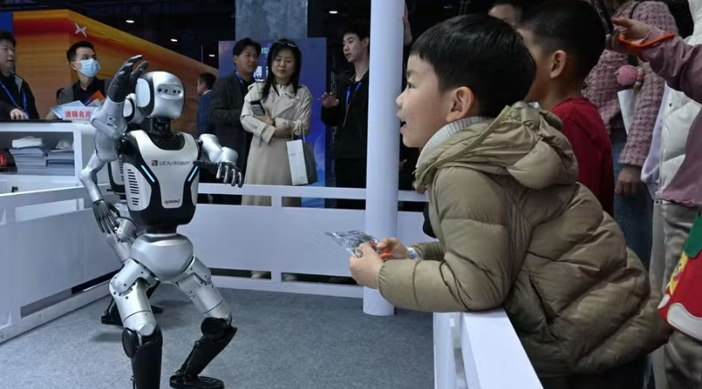 Menino observa robô durante Beijing Sci-Fi Carnival, em 28 de março | Foto: Adek Berry/AFP