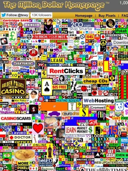 Pois bem, a grande ideia de Tew era a primeira versão das vaquinhas virtuais: criar um site e vender micro anúncios, cada pixel por 1 dólar, para financiar seus estudos. Nascia aí a Million Dollar Homepage, com investimento inicial de 50 dólares para o registro da página e dois dias de trabalho.