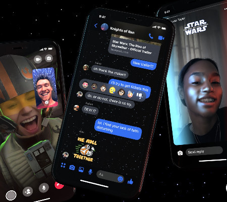 Às vésperas do lançamento do filme Star Wars: A Ascensão Skywalker, o Facebook revelou uma nova configuração que permite que os fãs utilizem filtros, figurinhas, reações e outros recursos da saga nas conversas do aplicativo Messenger no celular. O anúncio foi feito na quinta-feira, 12, em parceria com a Disney, detentora dos direitos dos filmes. A notícia está no site Terra.