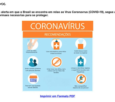 Uma das mensagens, por exemplo, promete um "portfólio" de recomendações para se proteger do coronavírus. A mensagem pode ter erros de português, mas essa não é uma característica obrigatória.
