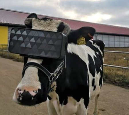 Uma fazenda russa deu a suas vacas leiteiras óculos de realidade virtual, numa tentativa de reduzir a ansiedade delas. Os óculos com sistema de realidade virtual foram adaptados para as "características estruturais das cabeças das vacas" e colocados em todo o rebanho. Cada aparelho recebeu um "programa exclusivo com imagens que simulam um campo durante o verão". A notícia está no site G1.