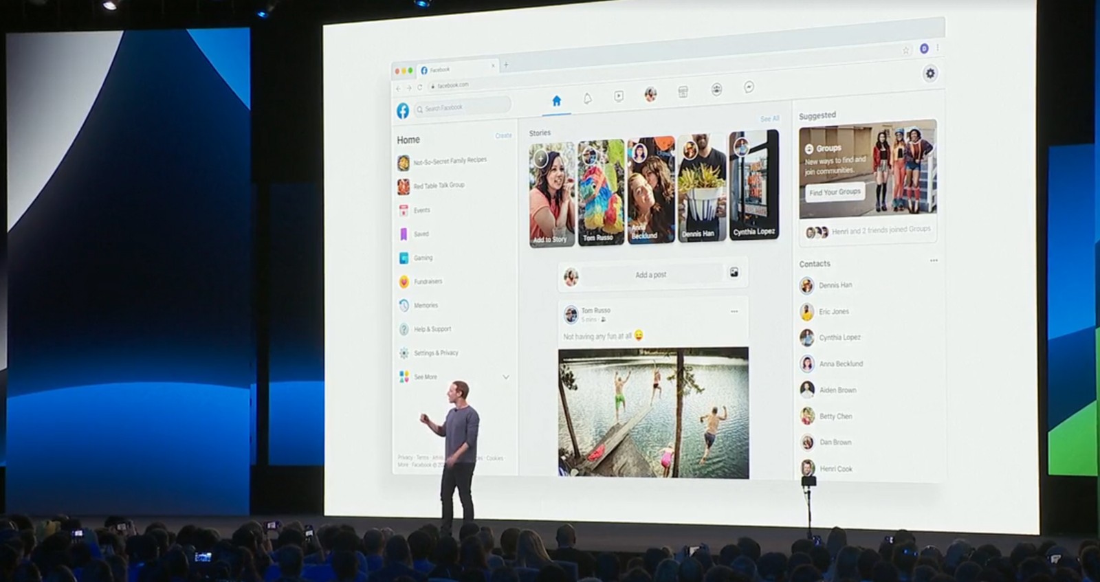 No evento na Califórnia, o presidente-executivo da empresa divulgou os primeiros passos do grupo nesse sentido, destacando novidades no Messenger, que ele promete que será "o aplicativo de conversas mais rápido" que existe, e a nova cara do Facebook.
