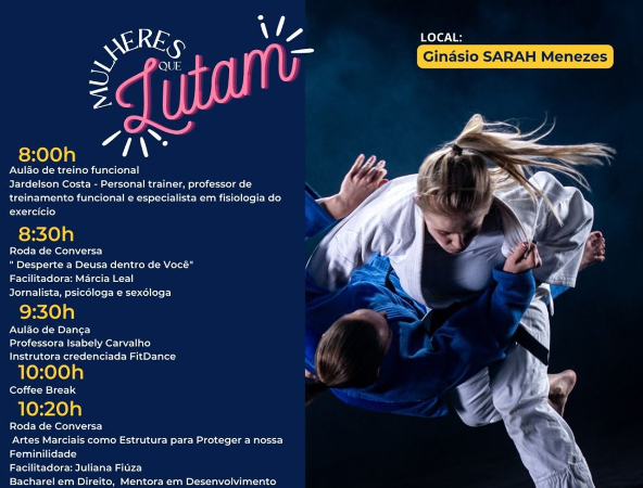 A programação contará com palestras, rodas de conversa, aulas de dança e treino funcional. O intuito é unir as mulheres que praticam as artes marciais, além de conscientizar a comunidade sobre a importância das lutas e desafios enfrentados pelas mulheres no dia a dia. O evento começa às 8h, veja a programação abaixo. As participantes poderão assistir às palestras e rodas de conversa sobre temas como artes marciais e feminilidade; e saúde; e outros.