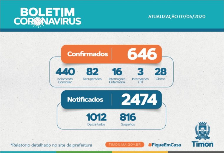 O levantamento feito pela Secretaria Municipal de Saúde da cidade de Timon, no Maranhão, divulgado no domingo, 07 de junho, mostra que 2474 casos já foram notificados, tendo 816 suspeitos, 1012 descartados, com 646 confirmados, 82 recuperados e 28 óbitos registrados.