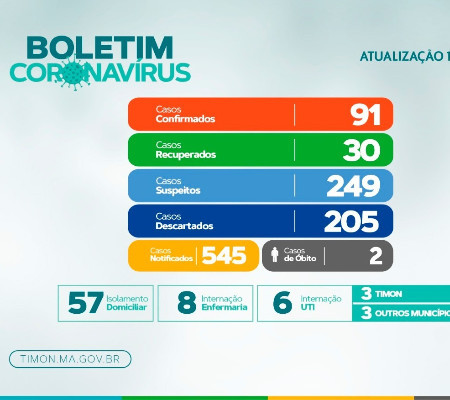O boletim epidemiológico da Covid-19, da noite de sábado (16/05), em Timon/MA, aponta na cidade 545 casos notificados, 249 casos suspeitos, 205 casos descartados, 91 confirmados, 30 recuperados e dois óbitos.
