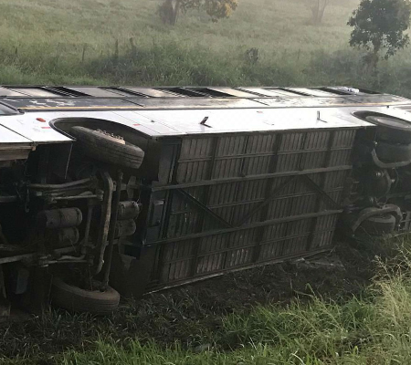 O coletivo caiu em um desnível de área verde, próximo ao acostamento da rodovia. O acidente não bloqueou o trânsito.