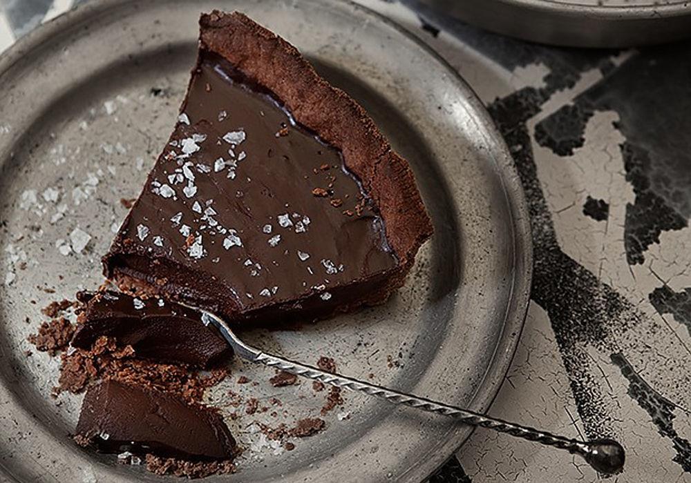 5 Adicione o creme de leite ao restante do chocolate e misture. Acrescente uma gema por vez, batendo a cada adição. Incorpore a manteiga aos ingredientes. Espalhe essa mistura sobre a base da torta e deixe gelar por pelo menos 2 horas. Polvilhe flor de sal antes de servir.