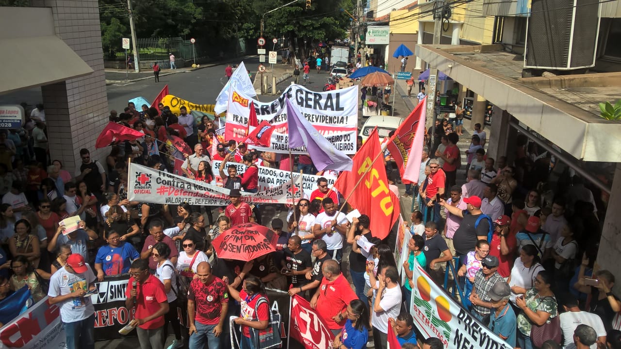 As Centrais Sindicais CUT, Sindserm, Sinte, Sinsepi, Sindcom e inúmeros sindicatos filiados realizaram, na manhã desta sexta-feira (22), na Praça Rio Branco, Centro de Teresina a uma mobilização nacional em Defesa da Previdência e Contra o Fim da Aposentadoria. Este é mais um grande ato unitário de 2019 que faz parte do resistência dos trabalhadores contra a Proposta de Emenda à Constituição (PEC) 06/2019, da reforma da Previdência de Jair Bolsonaro (PSL), que deve está tramitando no Congresso Nacional. O ato reúne centenas de trabalhadores. O trãnsito com destino a praça da Bandeira está interditado.