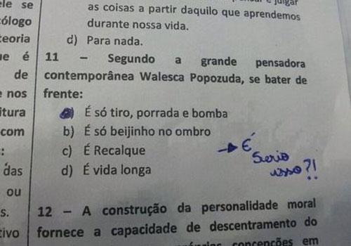 A questão de uma prova, aplicada por um professor de filosofia a estudantes do ensino médio da rede pública do Distrito Federal, está rodando as redes sociais e causando polêmica por citar a funkeira Valesca Popozuda como "grande pensadora contemporânea" no enunciado. A questão pede que os alunos escolham a opção que completa trecho de uma música de Valesca.