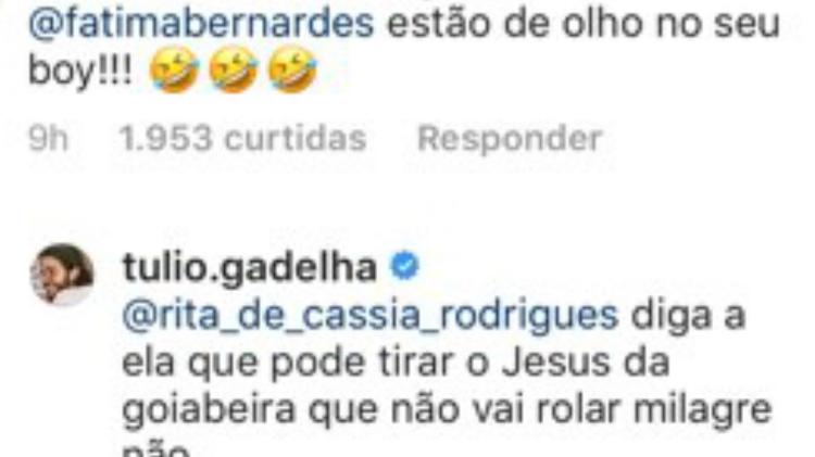 Após uma seguidora escrever: 'Fátima Bernardes, estão de olho no seu boy', Gadêlha foi bem direito: "Diga a ela que pode tirar o Jesus da goiabeira que não vai rolar milagre, não".