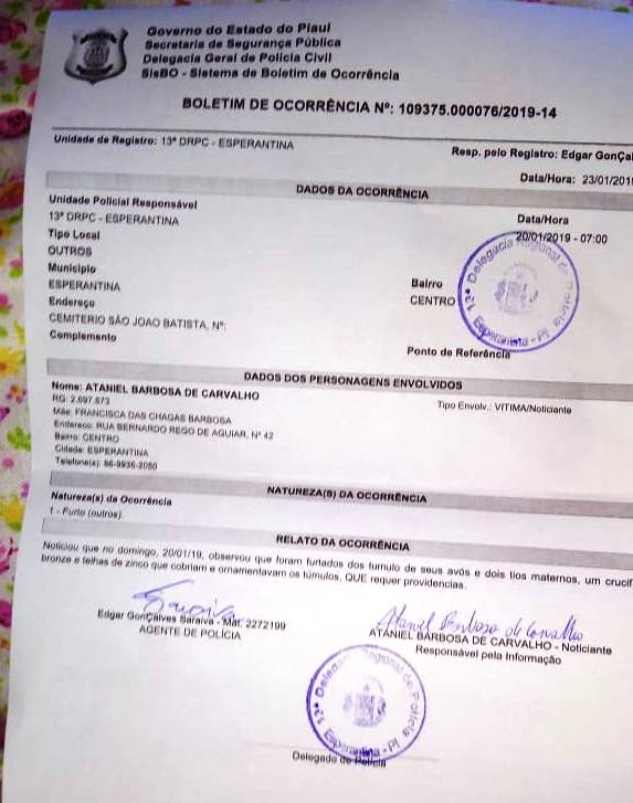 Ataniel Barbosa de Caravlaho procurou a 13ª delegacia de policia civil da cidade de Esperantina para denunciar que os túmulos de seus avós e tios maternos, sepultados no Cemitério São João Batista, centro da cidade foram violados.