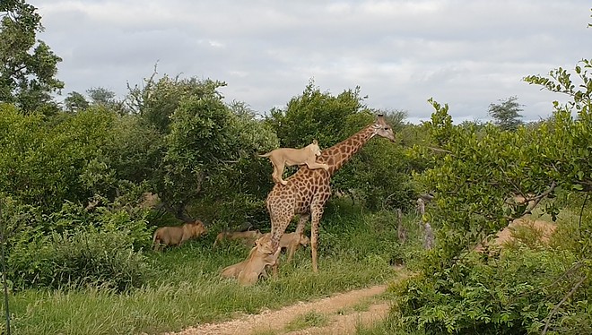 Passaram-se 20 minutos quando os leões, já acordados, se prepararam para atacar uma velha girafa que passava por perto. Pienaar conseguiu registrar em vídeo o momento do ataque: é possível ver a alcateia vigiando o animal de longe e, em seguida, atacando suas costas e pernas.
