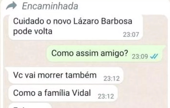 Um ano depois do assassinato de quatro pessoas da família Vidal por Lázaro Barbosa de Sousa, em Ceilândia, no entorno do Distrito Federal, parentes voltaram a ser ameaçados. A intimidação foi feita em abril, por WhatsApp: "Cuidado o novo Lázaro Barbosa pode volta (sic)". "Vc vai morrer também. Como a família Vidal foi. Se prepara. Estou indo aí".