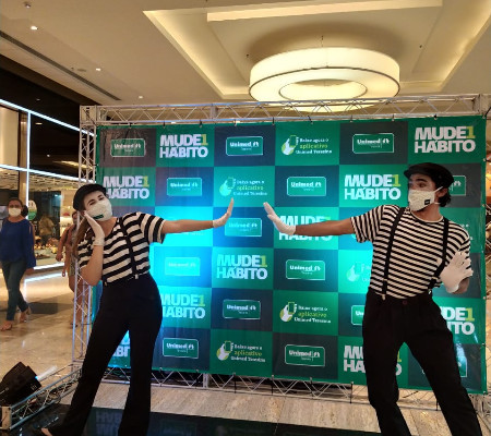 A Unimed Teresina realizou ontem (25), uma ação educativa de prevenção ao novo Coronavírus em um shopping da capital. De forma lúdica, mímicos orientaram os clientes do shopping que passavam pelo local, sobre as medidas de segurança e cuidados para evitar a Covid-19. Além disso, foram distribuídos frascos com álcool em gel para a higienização das mãos.