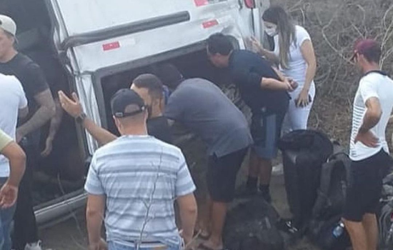 Imagens postadas nas redes sociais mostram várias pessoas ao lado da van, que capotou, e algumas deitadas no chão.