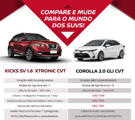 O segmento de SUVs está em ampla expansão no Brasil, tomando mercado até mesmo do segmento de sedãs médios. Mais versátil para o dia-a-dia, apto a enfrentar os buracos do cotidiano e com altura em relação ao solo de 20 centímetros, o Nissan Kicks SV 1.6 Xtronic CVT tem condições de conquistar sua preferência em comparação com o Toyota Corolla 1.8 GLI CVT, sedã tradicional com 5,6 cm a menos de altura em relação ao solo? Confira abaixo!