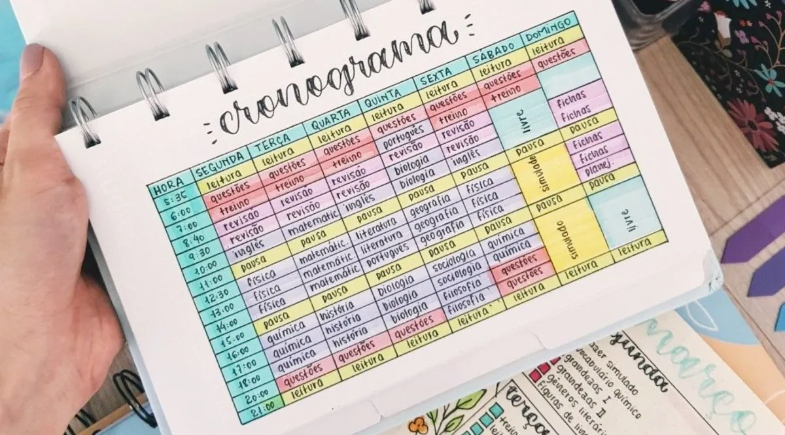 Defina um horário diário de estudos que seja realista e possível de cumprir. O mais importante é manter a constância sem prejudicar a saúde ou a qualidade de vida. Considere o tempo para descanso, deslocamentos e refeições, além de incluir atividades físicas e lazer, que ajudam no bem-estar e reduzem o estresse antes das provas.