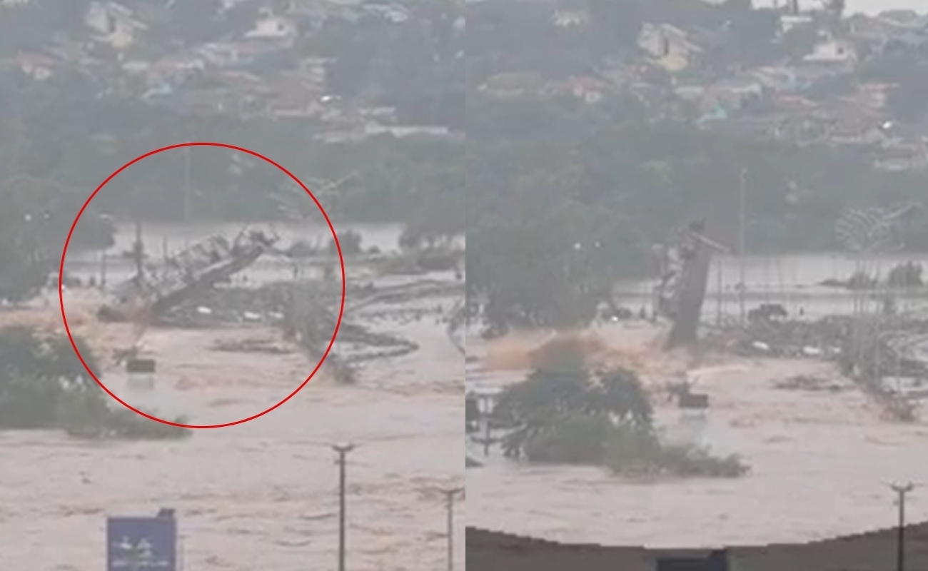 REGISTRO: Câmeras de segurança registraram o exato momento da colisão. Nas imagens é possível ver a balsa à deriva pelo Rio Taquari batendo contra a ponte, que fica na BR-386. O rio está com nível acima de 30 metros. Segundo o governo do RS, a balsa teria passado por Muçum, Roca Sales, Encantado e Arroio do Meio até a colisão. Ela não estaria transportando pessoas, mas havia carros sobre a estrutura.