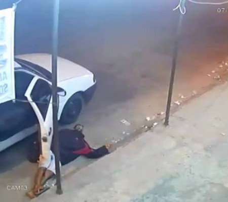 A correria foi justamente o que dificultou a situação, pois o jovem acabou caindo outras duas vezes no chão. Por fim, o colega consegue colocá-lo dentro do carro, que sai em disparada com a porta aberta e as pernas do assaltante para o lado de fora.