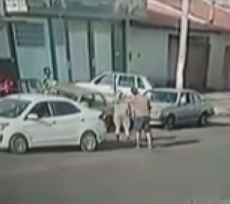 As imagens mostram que, enquanto o homem retira o carro da calçada e faz uma manobra na avenida, a mulher dá um tapa no capô do veículo. O motorista desce e começa a discutir com a vizinha.
