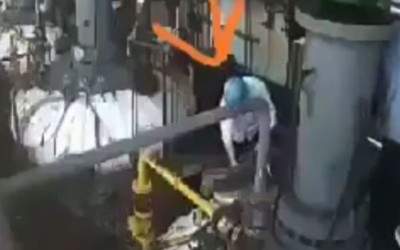 As imagens do circuito interno de uma fábrica de detergentes registraram o momento trágico de um trabalhador que foi atingido segundo informações, por um jato de gás no momento em que realizava manutenção em cima de um tanque com produto químico.