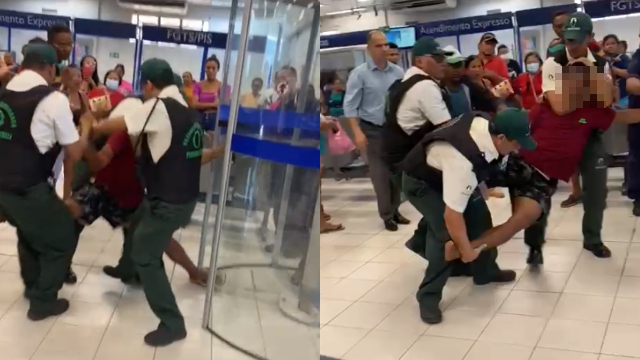 Nas imagens ainda é possível ver que, além dos agentes de segurança da Caixa Econômica, outros dois homens que estavam no local, também auxiliaram na imobilização do indivíduo. Um total de quatro pessoas tentaram imobilizá-lo.