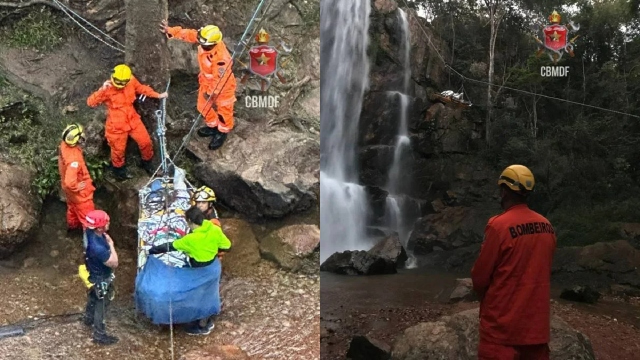 Para garantir o atendimento adequado, a equipe de resgate imobilizou a vítima em uma prancha do CBMDF e providenciou duas mantas térmicas para mantê-la aquecida. Após os primeiros procedimentos, ela foi transferida para uma maca do tipo cesto. A remoção foi realizada por meio de uma tirolesa até o topo da cachoeira.