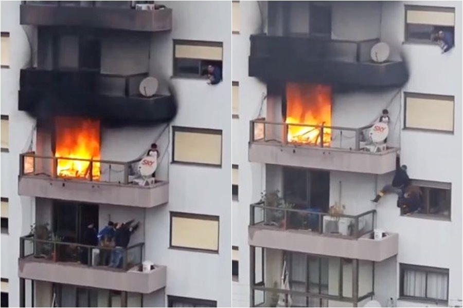 Nesse momento tenso, o homem parece romper uma tela de proteção da sacada para resgatar o garoto. O Corpo de Bombeiros confirmou o incidente, informando que um adulto ficou ferido no incêndio, que foi controlado pelas equipes de resgate.