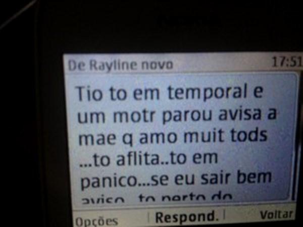 A mensagem de Rayline foi enviada para o celular do tio, Rubélio Santos. "Recebi a mensagem às 13h. Imediatamente tentei ligar para ela, mas só dava fora de área. Então avisei para um colega meu que trabalha na Infraero e ele avisou sobre a situação", relata. "Temos esperança que ela esteja viva, sim. Temos fé em Jesus", declarou o tio da enfermeira.