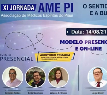 A XI Jornada da Associação dos Médicos Espíritas do Piauí (AME- PI) acontece nesta quarta-feira (14) de forma online e presencial no auditório Femaria, na vila Bandeirantes, em Teresina. Na ocasião, os palestrantes discorrerão sobre temas atuais na área da ciência e saúde.