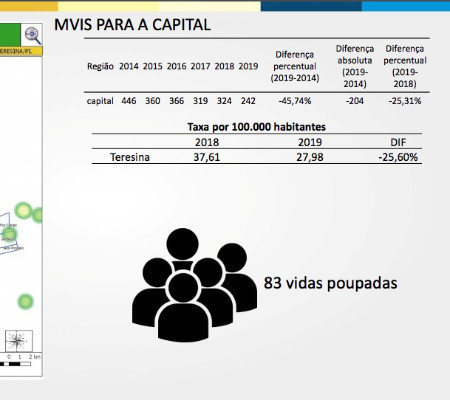 De acordo com os dados divulgados, as Mortes Violentas Intencionais (MVIS), apresentaram uma redução de 6,73% no Estado do Piauí, sendo 25,60% na taxa da capital. Comparando os números com o ano de 2018, cerca de 83 vidas poupadas em Teresina, e 42 vidas em todo o Estado do Piauí.