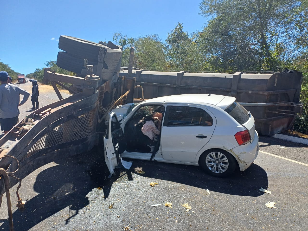 A carreta, que estava carregada com milho, ficou tombada na pista, mas o motorista do veículo saiu ileso. O Gol ficou com a dianteira completamente destruída. A PRF informou, ainda, que a pista já está sendo desobstruída.