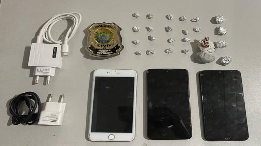 No momento do cumprimento do mandado contra ele, o adolescente estava em uma residência que estava sendo utilizada como ponto de tráfico de drogas. Foram apreendidas porções de crack e maconha, além de três aparelhos celulares.