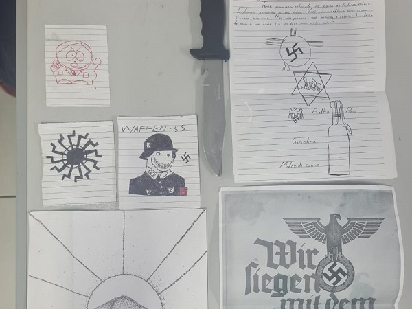 Conforme o delegado Humberto Macola, titular da DRCI, um adolescente criou perfil em rede social e com apologia ao nazismo e fazia ameaças de ataques à rede de ensino de Teresina. “Na casa foi encontrado panfletos colados na parede do quarto do nazismo e faca tática de uso pessoal”, explicou o delegado.