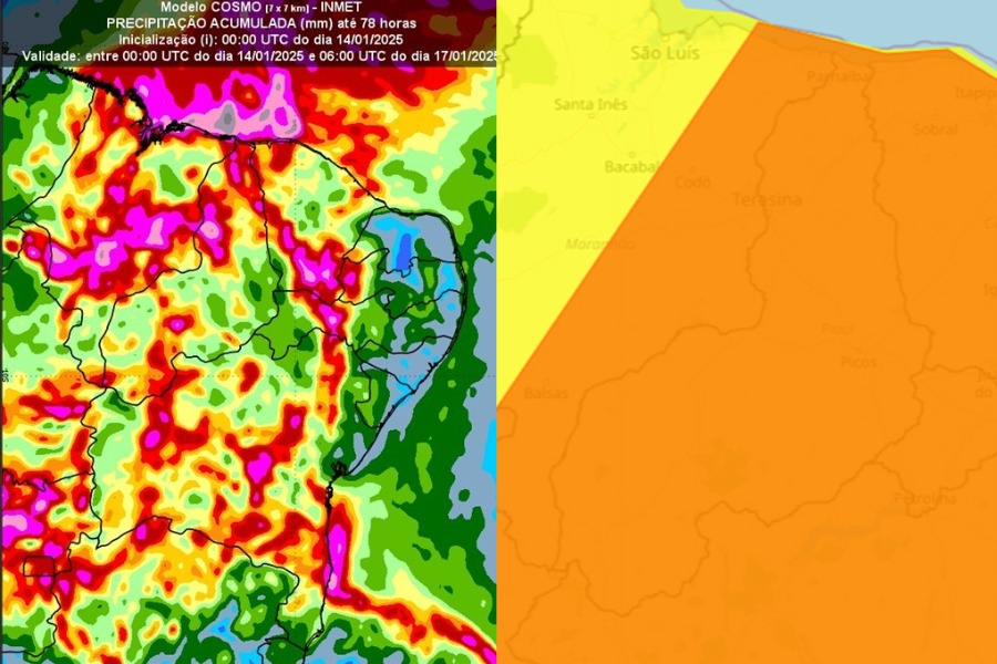 O Piauí está sob alerta laranja, que significa que pode cair chuva intensa em todo o Estado com ventos que podem chegar a 100 km/h, com chuva entre 30 e 60 mm/h ou 50 e 100 mm/dia. O alerta é válido até as 11h desta quinta-feira (16). Nesse período, pode ocorrer baixo risco de corte de energia elétrica, queda de galhos de árvores, alagamentos e de descargas elétricas.