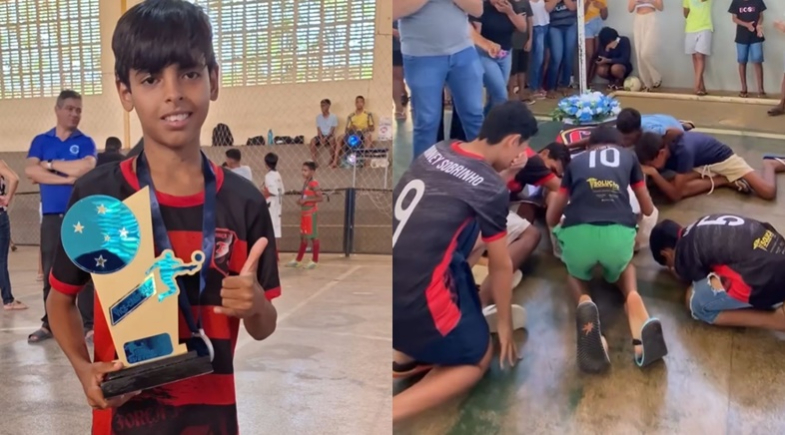 Durante a despedida, técnicos, amigos e colegas de time realizaram o chamado “gol com caixão”, ritual tradicional entre apaixonados por futebol. O caixão foi levado até o ginásio e colocado em frente à trave. Em seguida, os jovens chutaram a bola para encenar o último gol do garoto. Após a jogada simbólica, todos correram para abraçar o caixão em um ato marcado por emoção e lágrimas.