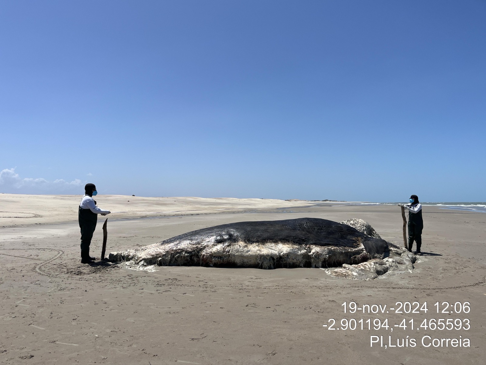 Na manhã desta terça-feira (19), uma baleia-cachalote encalhou na praia de Maramar, em Luís Correia, Litoral do Piauí. Conforme Werlanne Mendes, vice-presidente da ONG Instituto Tartarugas do Delta (ITD), a carcaça do animal estava em estágio avançado de decomposição.