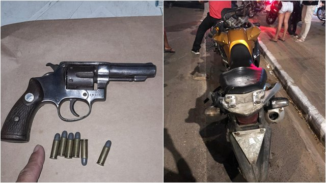 Em seguida, foram avistados dois indivíduos, que logo após acompanhamento tático, foi dado voz de parada, porém não obedecida. Na fuga os suspeitos adentraram ao bairro Barro Vermelho e na sequência, derraparam e caíram em uma curva. Um dos indivíduos ficou no solo e com ele foi encontrado uma pistola Taurus 380 e os celulares.