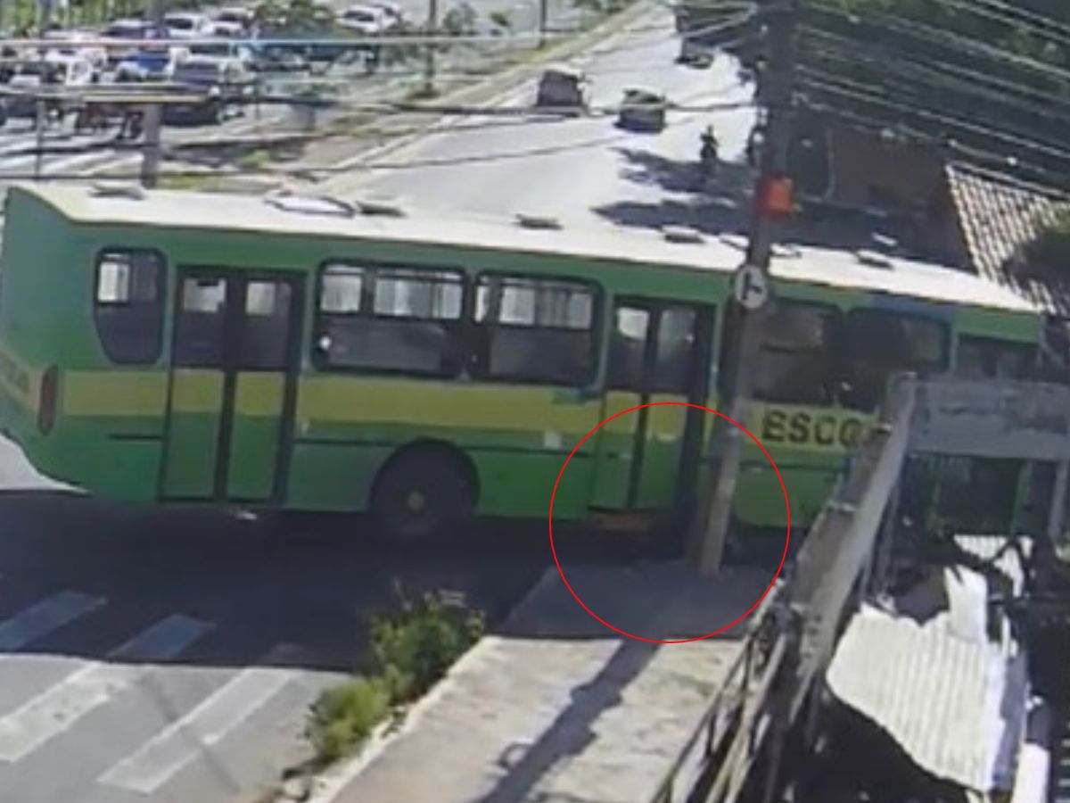 Um motociclista foi atropelado por um ônibus, que fazia conversão à direita. Nas imagens é possível ver que o condutor da moto se levanta logo após o acidente, mas a motocicleta acabou ficando debaixo do veículo.