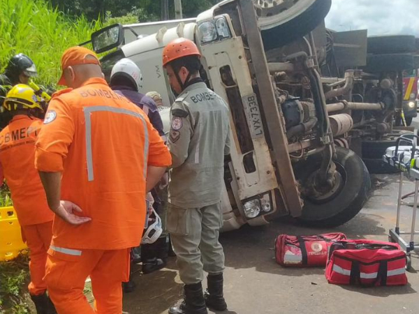 Segundo informações da PRF, o motorista saiu ileso e dois passageiros ficaram presos na cabine do caminhão. Outro teve escoriações na perna.