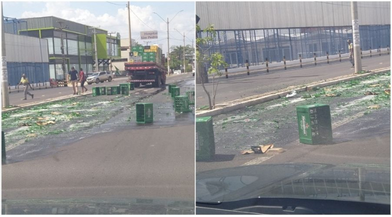 Um caminhão carregado com cervejas da marca Heineken derrubou parte da carga na Avenida Barão de Gurguéia, zona Sul de Teresina, em frente ao complexo esportivo De Resenha e próximo a academia Timefit, no início da tarde desta terça-feira (30).