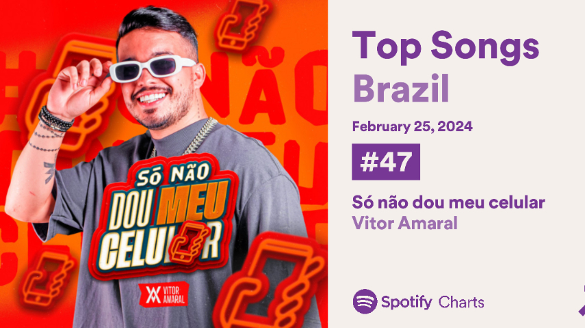 De Teresina para todo o Brasil! A música do cantor teresinense Vitor Amaral, “ Só não dou meu celular”, está no Top 50 das músicas mais ouvidas do país no Spotify, um dos maiores streamings populares e usados do mundo, nesta segunda-feira (26). O videoclipe possui mais de 2 milhões de visualizações no Youtube.