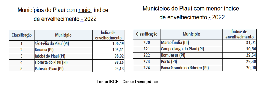 Em 2010, esse índice para o Piauí foi de 28,0, evidenciando o processo de envelhecimento da população no estado. O município com o maior índice de envelhecimento no estado é São Félix do Piauí (106,5), enquanto o menor índice de envelhecimento ficou com o município de Baixa Grande do Ribeiro (20,9).